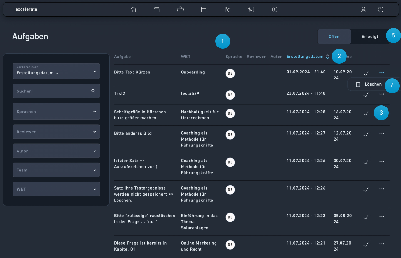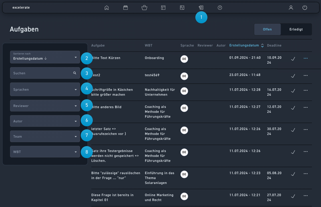 8. Mithilfe des Filters WBT siehst du alle Aufgaben innerhalb eines WBTs.