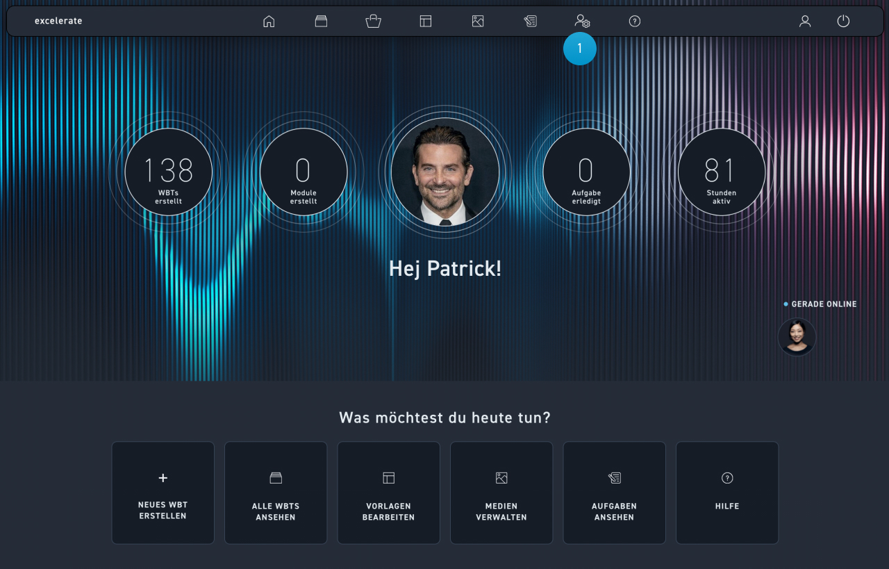 Das Dashboard ist dein Startpunkt für alle deine Aktivitäten in excelerate. Es bietet dir eine Übersicht über alle Bereiche. Du hast hier auch den direkten Zugriff auf alle Funktionen für die Erstellung und Verwaltung deiner WBTs, Medien, Vorlagen und Aufgaben. Dabei kannst du die wie gewohnt die Navigationsleiste oben oder die Aktionskacheln weiter unten verwenden. Das Dashboard zeigt dir auch interessante Statistiken zu deiner Produktivität. Und du siehst, wer außer dir im Moment in excelerate angemeldet ist.