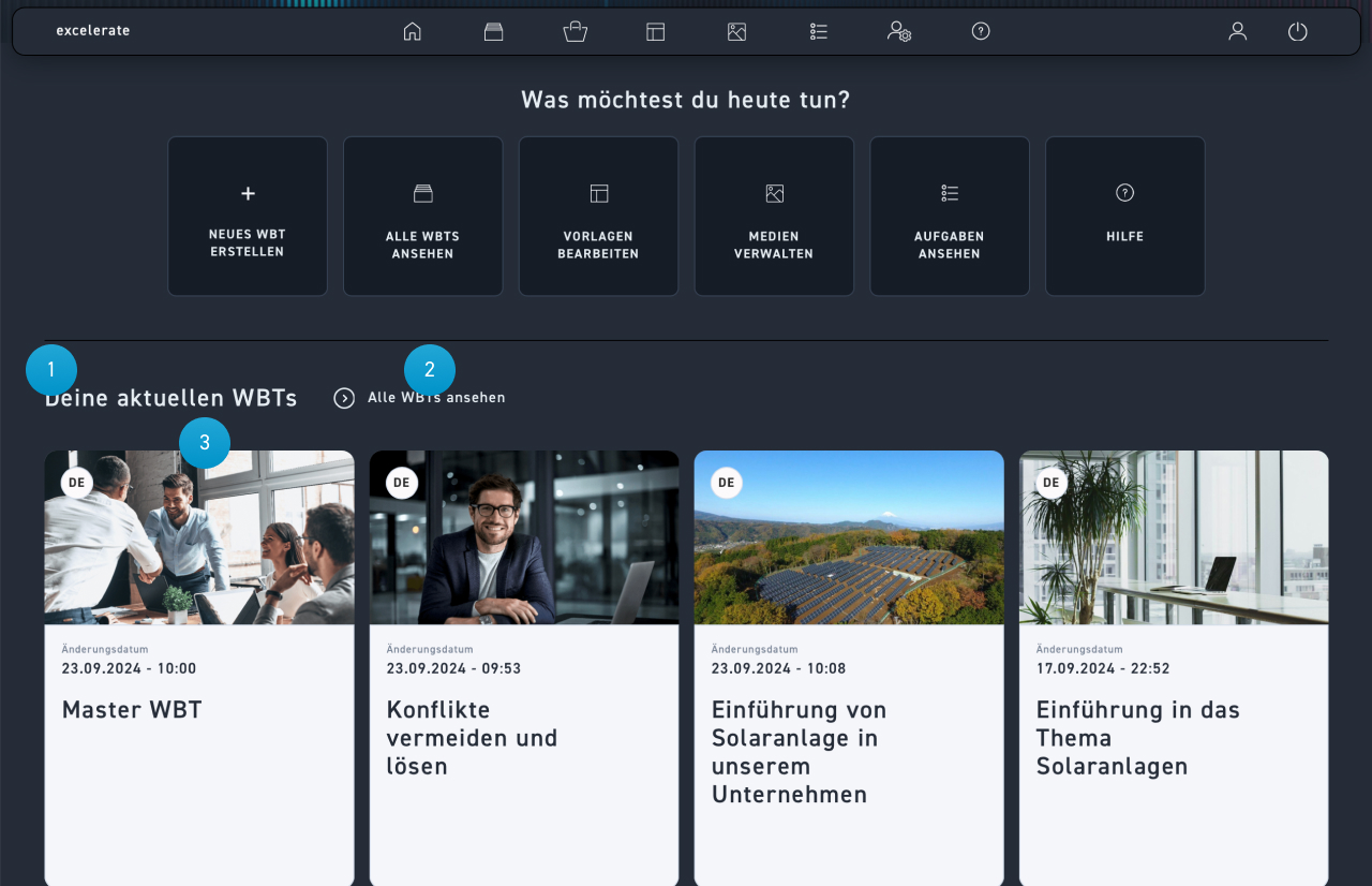 4. Die Optionen aus der Hauptnavigationsleiste findest auch als Kacheln. Zusätzlich kannst du direkt ein neues WBT erstellen.