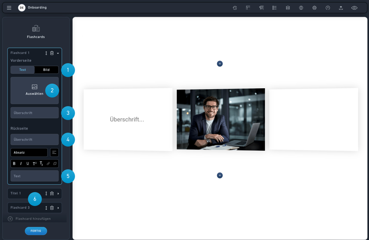 Nutze Flip Cards, wenn du interaktive, spielerische Inhalte präsentieren möchtest, wenn du Lernende aktiv in den Lernprozess einbinden möchtest, z. B. durch spielerische Elemente. Flip Cards sind gut für spielerisches Lernen, Begriffsdefinitionen oder kurze Erklärungen. Verwende Flip Cards für kurze Informationen auf der Vorderseite und weiterführende Details oder Erklärungen auf der Rückseite.