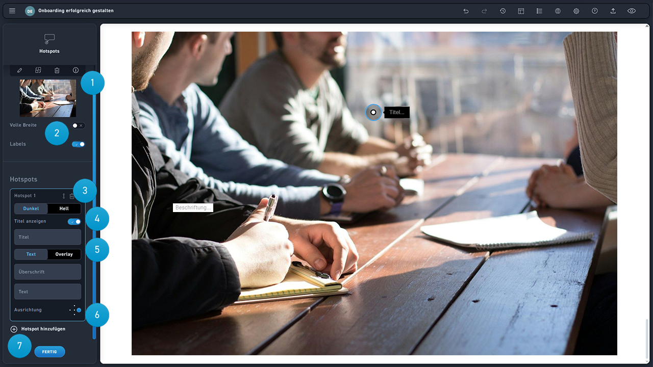 Verwende das Hotspot Element, wenn du ein Bild verwenden möchtest, das detaillierte Erklärungen an bestimmten Stellen benötigt (z. B. Situationen mit mehreren Personen, Produktanatomie oder Lagepläne, Diagramme, komplexe Infografiken oder Screenshots). Nutze Hotspots, wenn du komplexe visuelle Inhalte erklären möchtest.