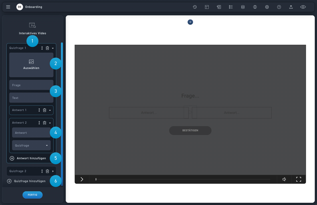 1. Unter Quizfrage wird ein einzelner Videoschnipsel verstanden, der deinem Lernenden vor einer Frage angezeigt wird.