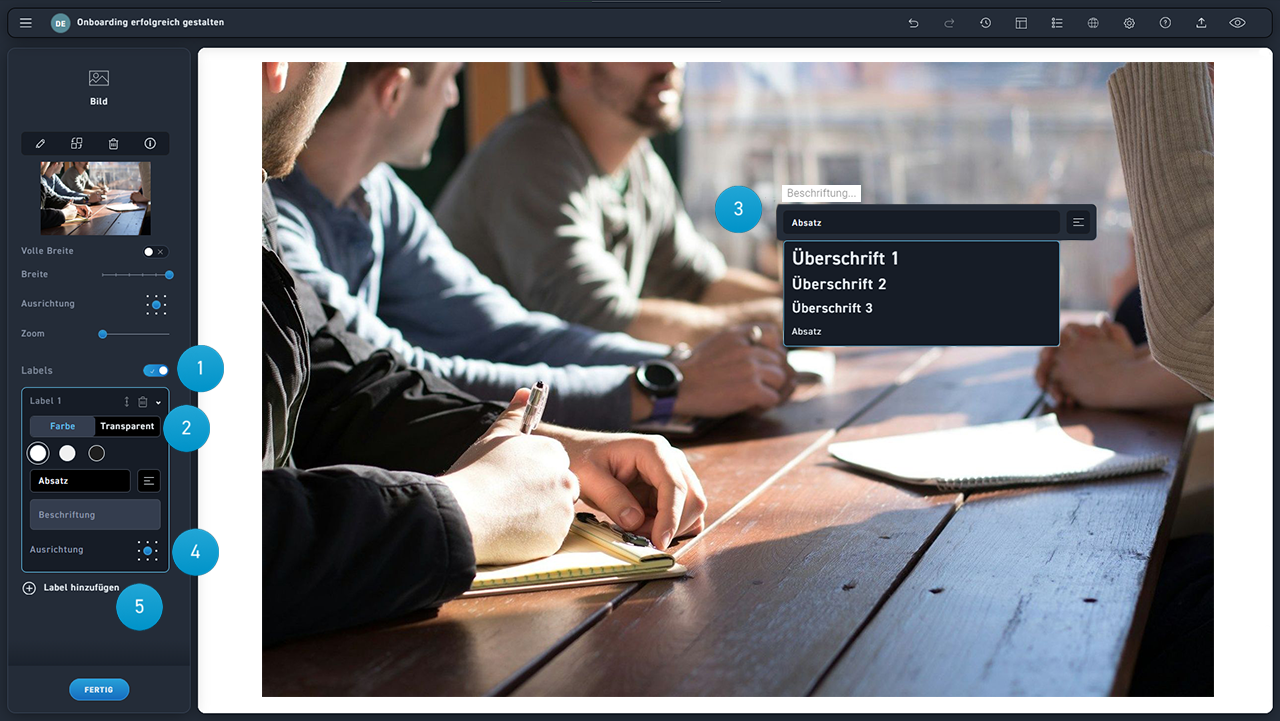 Labels sind Textfelder, die du in zum Beispiel Bilder oder Hotspots einfügen kannst. Mit diesen kannst du Elemente direkt im Editor beschreiben und Übersetzten.