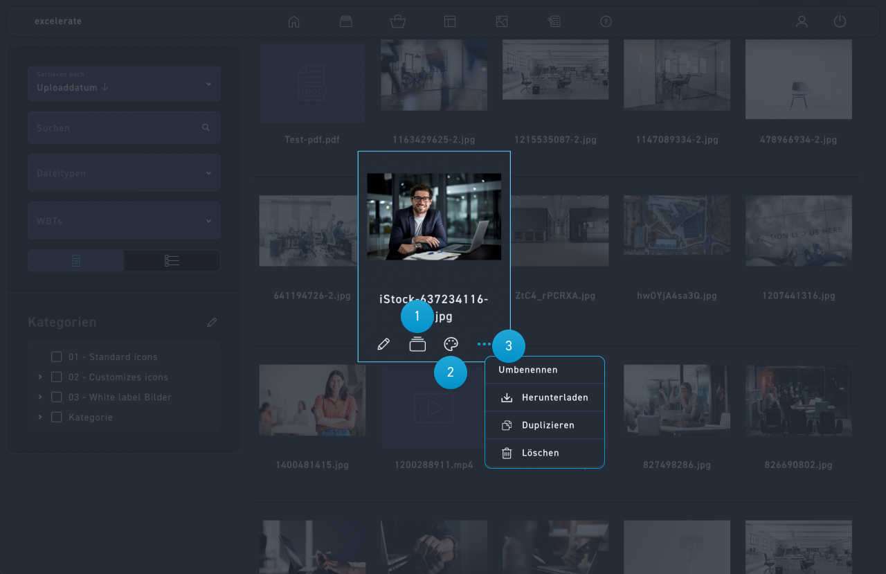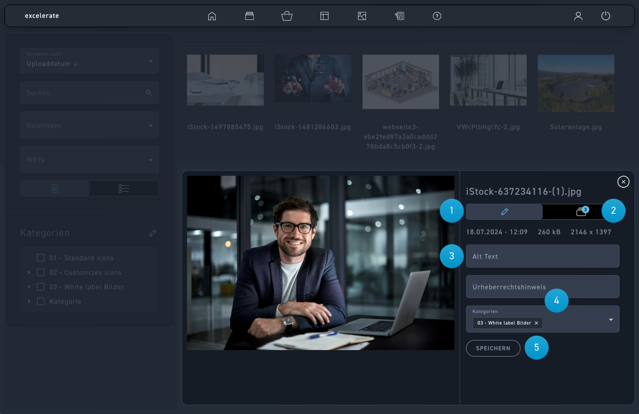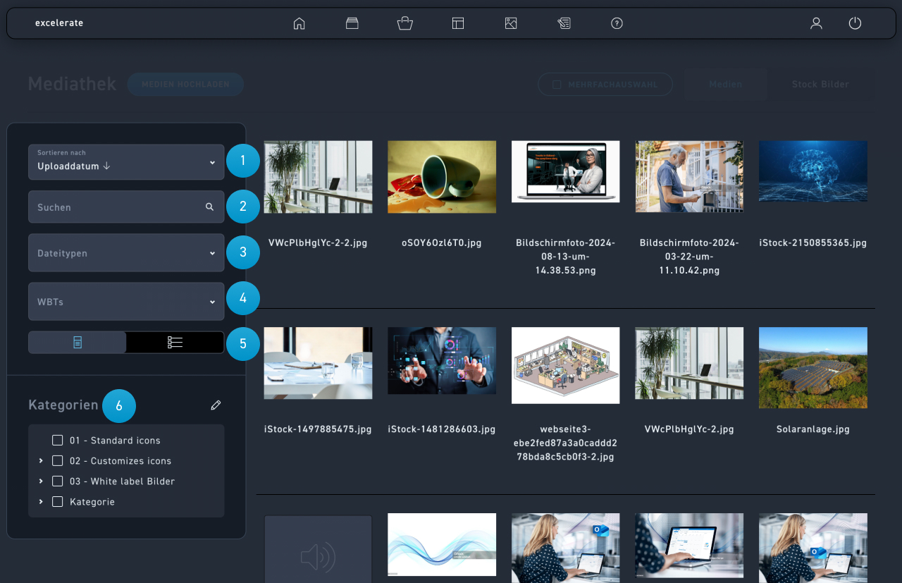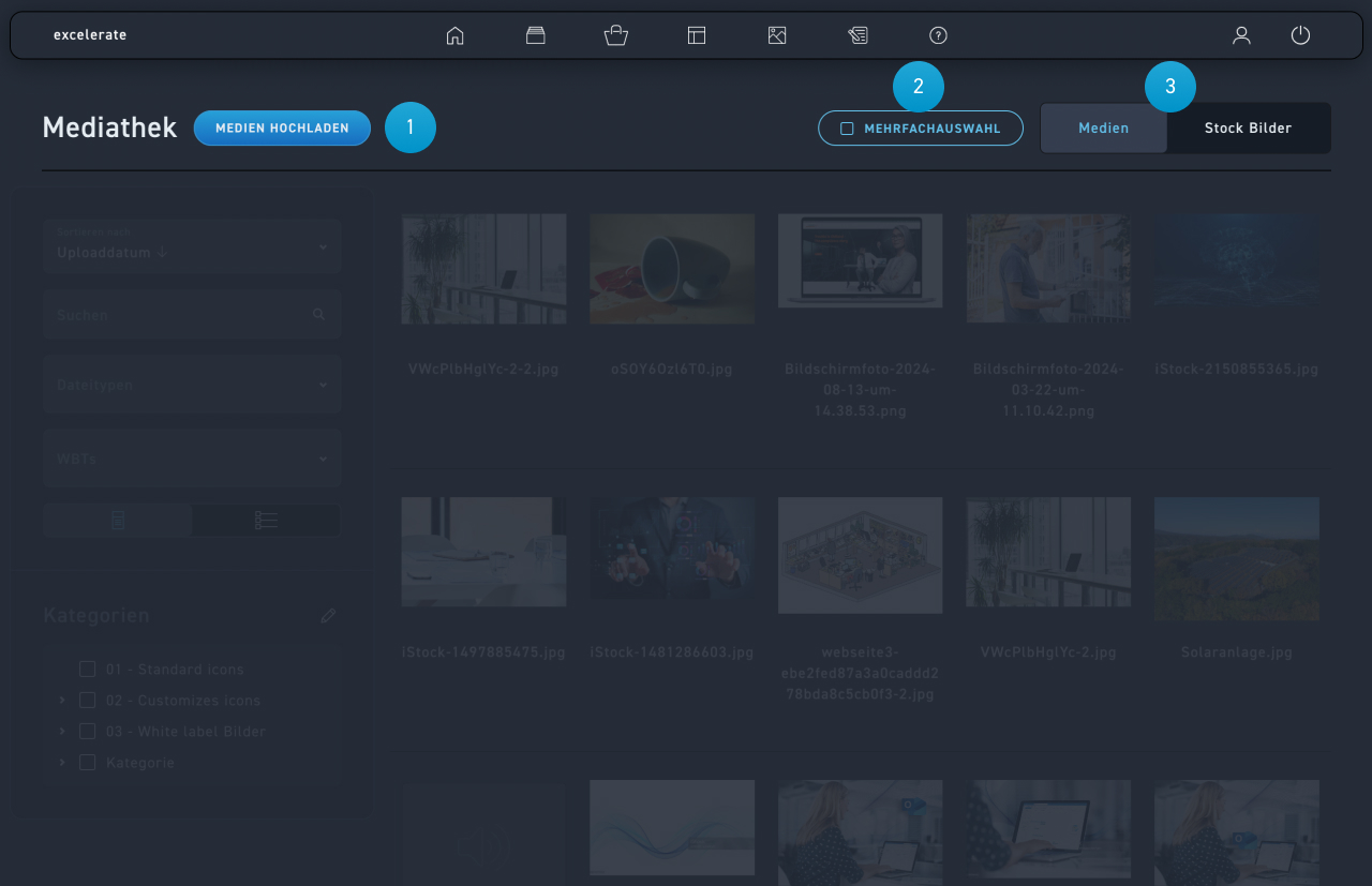 Die Mediathek ist der Ort für alle hochgeladenen Medien. Dazu gehören Dateitypen wie Bild (*.jpg, *.png) Audio, Video, Dokumente und Archivdateien (*.zip, *.rar). Du kannst hier deine Medien ansehen, filtern, sortieren und neue Medien hochladen. Hier nimmst du auch alle Einstellungen an den. Medien vor.
