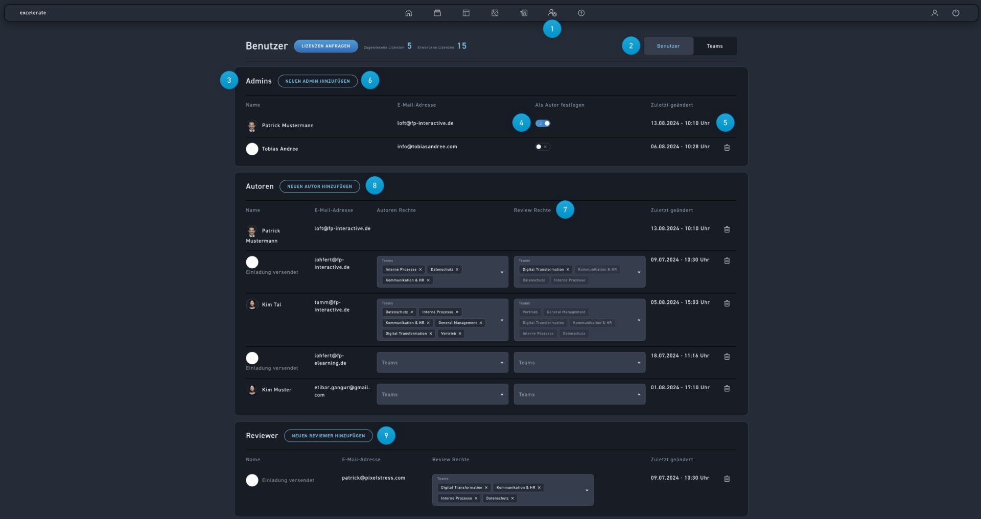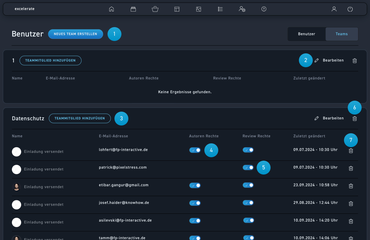 Die Nutzerverwaltung ist nur für Administratoren sichtbar. Hier kannst du verschiedene Nutzertypen hinzuzufügen, entfernen und in Gruppen einteilen (sog. Teams).