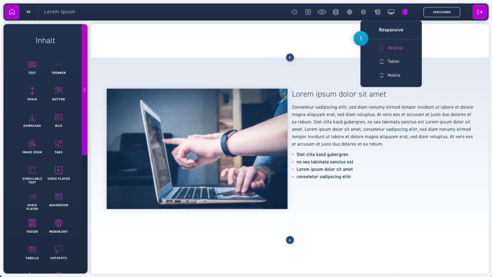 Klicke auf das Monitor Symbol in der Menüleiste, um zu sehen, wie dein WBT auf verschiedenen Displaygrößen aussieht. Wähle in dem Dropdown das gewünschte Display aus. Deine Ansicht passt sich nun dem entsprechenden Gerät an.