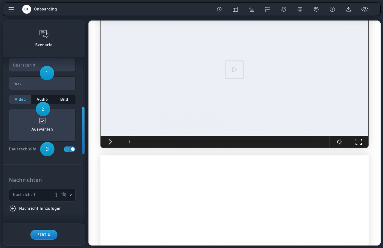 Das Szenario kann mit einem Bild, einem Video oder einer Audiodatei eingeleitet werden. Klicke dazu auf den entsprechenden Button und lade deine Datei hoch.