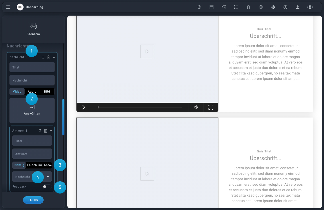 Mit dem Szenario Element kannst du Situationen für deinen Lernenden als interaktives Erlebnis abbilden - oder als Quiz gestalten.