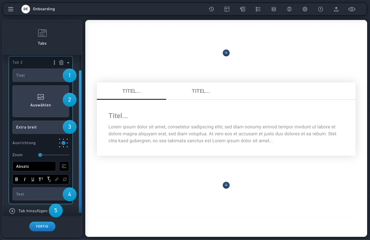 Wähle Tabs, wenn du mehrere Teile, Aspekte oder Eigenschaften einer Sache textlich erklären möchtest oder wenn du Inhalte logisch gruppieren und in Kategorien unterteilen möchtest. Nutze die Tabs, wenn du Inhalte hast, die nicht gleichzeitig sichtbar sein müssen.