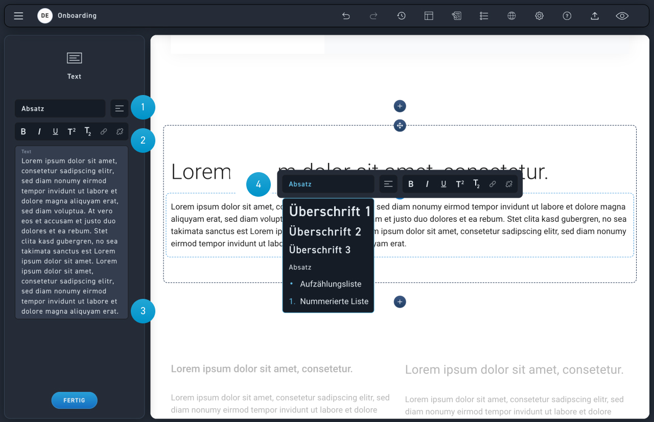 Textelemente können Überschriften oder Fließtext darstellen. Es können auch mehrspaltige Texte erstellt werden. Mehr dazu unter “mehrspaltige Text- und Bildelemente”.